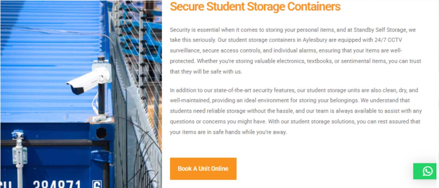 In the example below, its section discussing the security measures for student storage at its Aylesbury location includes an image of one of its security cameras. This reassures potential customers that the site is secure.