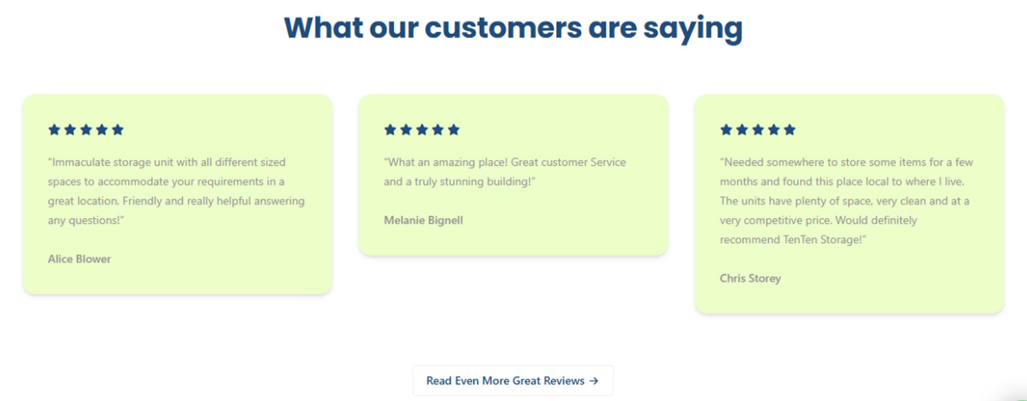 Stora customer TenTen Storage displays its reviews on its homepage and makes it easy for people to find more. This shows that the company is transparent with its feedback and proud of its record.