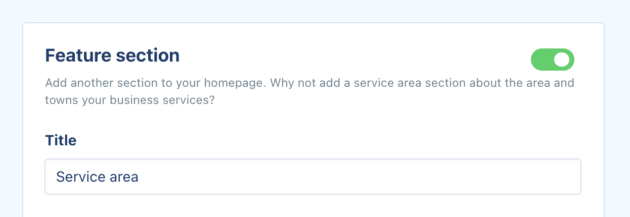 Want to add some completely unique content to your Homepage? Well, now you can! Visit your Homepage edit form and turn on the new Feature Section. You can add any title, text and image you like. This is great for telling your customers about a unique aspect of your business, or adding some search engine optimised content like the towns/areas you service.