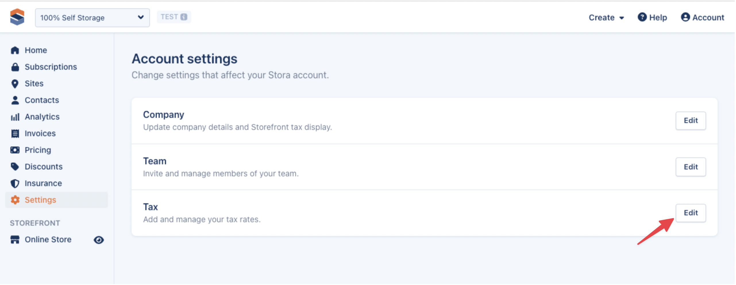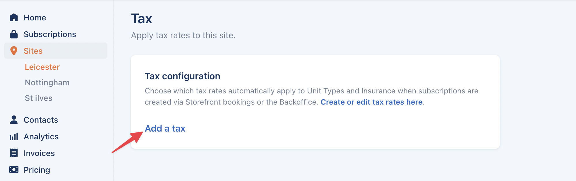 Next, go to Sites, select the Site you wish to edit and select Edit Site. Scroll down to the Tax section. If your Site already has Tax Rates set up you will see these here, if not select Add a Tax.
