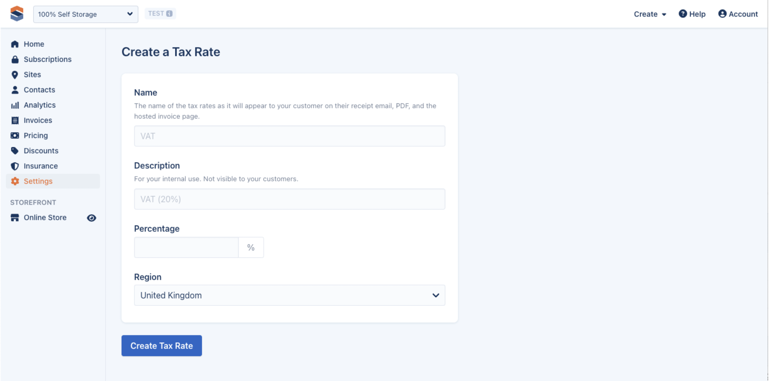 Fill out the appropriate information and press Create Tax Rate. Please note that once a Tax Rate has been created, the % amount cannot be changed.