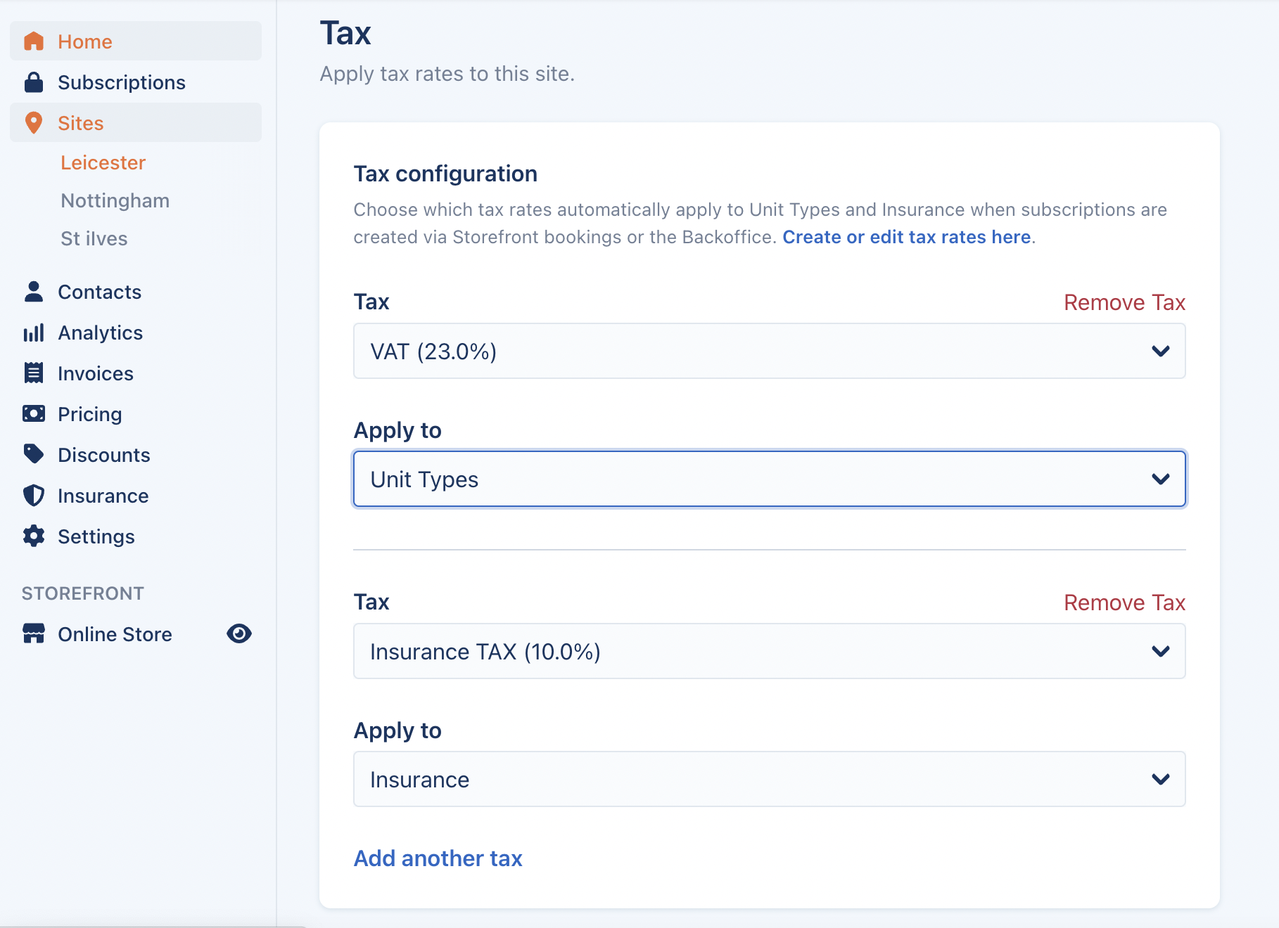 Each site can now have different tax rates configured for it. Once configured, you can select which line item a tax rate should apply to; Unit Types or Insurance/Protection. You can configure multiple taxes per line item. You can also opt not to configure any taxes at all if no taxes are required.