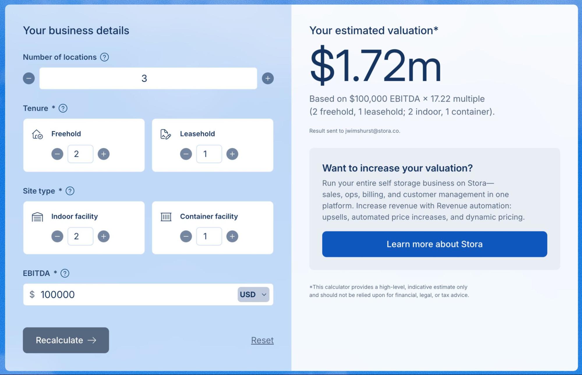 Stora’s valuation calculator shows how much your facility could be worth based on its income, expenses, and occupancy. It enables you to pressure-test assumptions or compare opportunities before investing in self storage.