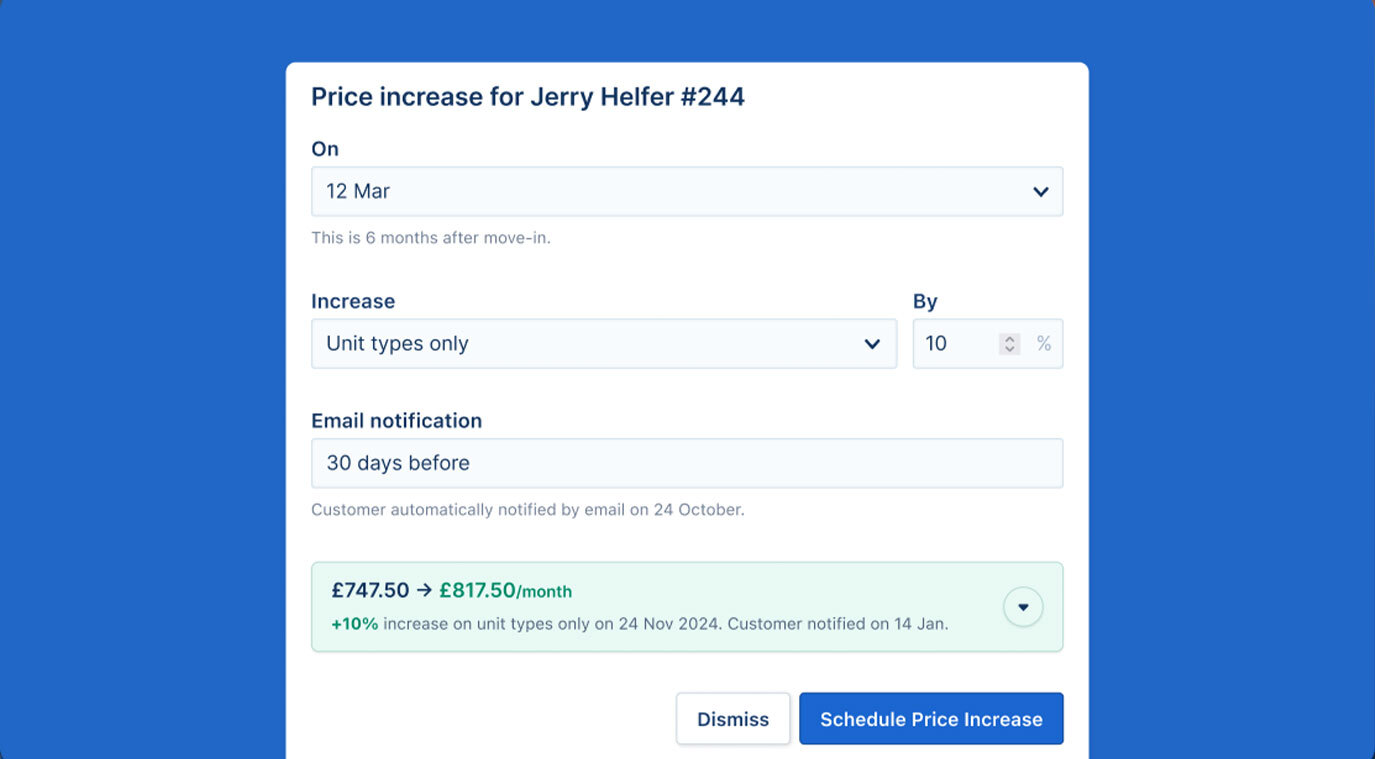 We’re excited to launch Price Increases, a powerful new feature in Stora that helps self storage operators boost revenue effortlessly. The best part? Once scheduled, price increases are fully automated. No more manual calculations, spreadsheet tracking, or individual notifications, just a seamless way to optimize pricing and maximize revenue with minimal effort.
