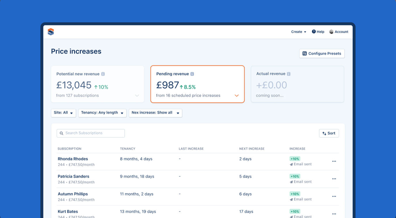 Once your rules are set, Stora identifies all applicable tenant subscriptions, allowing you to choose when to implement increases. Simply click Increase Price for a tenant’s subscription, review the projected revenue boost, and press Schedule Price Increase. You can also override presets for specific customers if needed, ensuring flexibility while maintaining an efficient process.