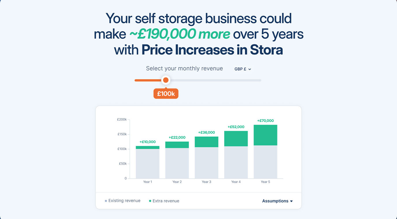 Try our free revenue growth calculator to see how price increases can impact your storage business over the next five years. Adjust the monthly revenue slider to visualize potential long-term gains.