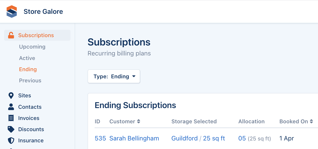 Our new Ending subscriptions view shows all subscriptions that have been cancelled and have an upcoming move out date. It makes it easier than ever to quickly find tenants leaving your facility.