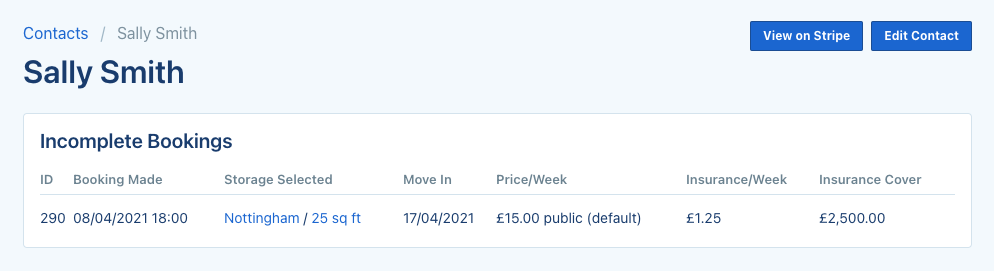 Sometimes your Storefront visitors complete your booking form but don't enter their payment details in order to set up their subscription. These leads stand a great chance of becoming customers in future, and we want to make sure you know about them so you can get in touch to try and finalise the sale. To help, you can now view any incomplete bookings on the page for that contact in Stora. This includes their contact info, and details on the storage they selected.