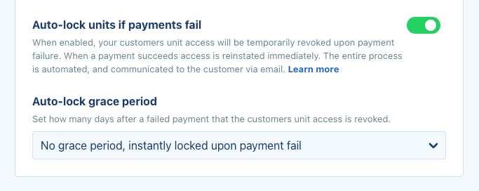 If you're using a smart entry system like Nokē or BearBox you can now enable your customers units to be auto-locked when recurring payments fail. You can even set a grace period of a few days should you choose before they're locked. To make your life easy the entire process is automated with your customers getting emailed and asked to retry their payment.