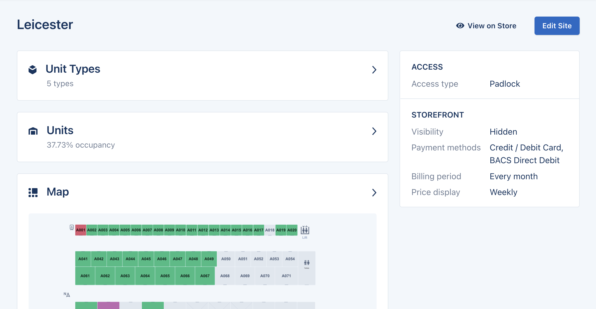 We’ve evolved our Site pages to make them more useful than ever. When you next login you’ll no longer see a list of Units straightaway, instead you’ll get some high level info about Site such as occupancy, and quick easy ways to drill into specifics about your Site. For now you’ll see sections which link to Units and Unit Types, soon you’ll launch your Map from here too and even more new features in future. The new Site page lays much of the ground work for what’s to come.