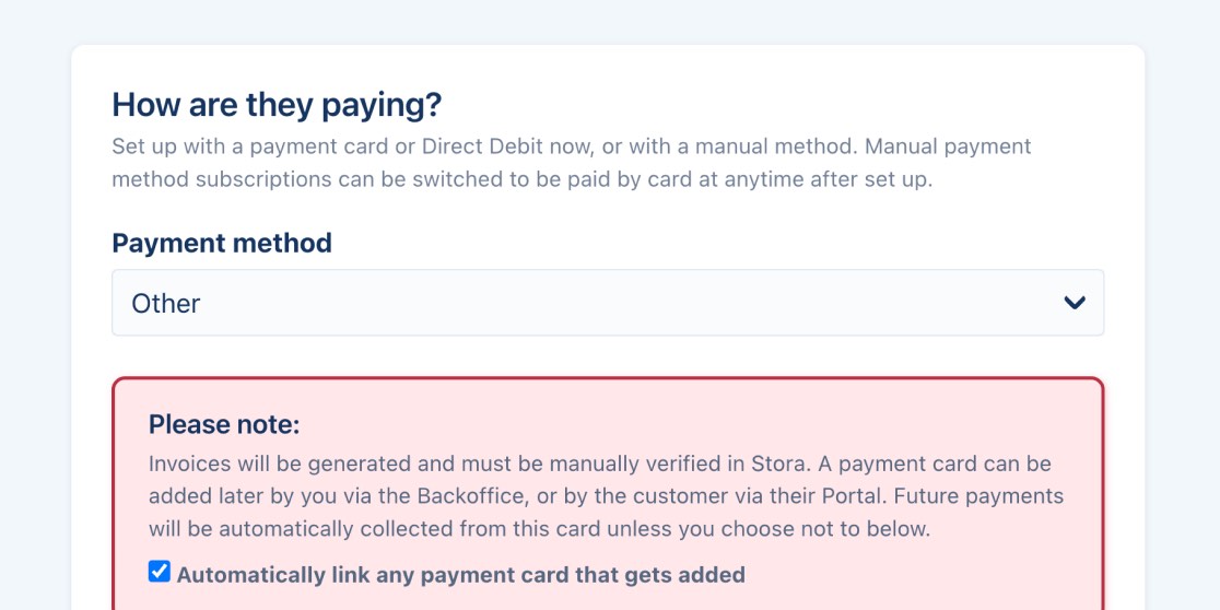 Let's say you've added your customers and their subscriptions to Stora, but you don't quite have a payment method yet. You can now set any subscription while creating it, or after it's been set up to "awaiting payment card". This means that once a payment card gets added by you or your customer via their portal, all future payments will be taken from it.