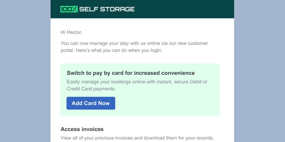 Our new Payment Card Request email is designed to get your customer to link their card for future subscription payments. It's a new effortless way to let them know you've changed how they'll be paying you, and walks them through how to change themselves over to your new approach (with Stora).